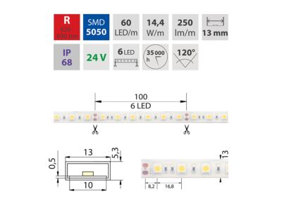 MCLED Pásek LED SMD5050 R, 60LED/m, 14,4W/m, 250lm/m, IP68, DC 24V, 13mm, 5m