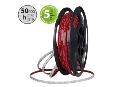 Stmívatelný LED pásek SMD5050, RGB - barevný, 8W, 60LED, 280lm/m, segment 100mm, 6LED/segment, IP67, DC 24V, životnost 50000h, šíře 12mm, bílý PCB pásek, max. délka pásku při jednostranném zapojení: 15m, opatřen samolepící páskou 3M. Délka 50m.