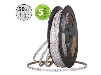 Stmívatelný LED pásek SMD5050, RGB - barevný, 8W, 60LED, 300lm/m, segment 100mm, 6LED/segment, IP20, DC 24V, životnost 50000h, šíře 10mm, bílý PCB pásek, max. délka pásku při jednostranném zapojení: 15m, opatřen samolepící páskou 3M. Délka 50m.
