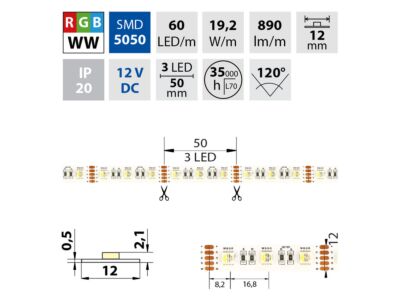 LED pásek SMD5050, RGB + teplá bílá (3000K), 19,2W, 60LED, 890lm/m, CRI>80, segment 50mm, 3LED/segment, IP20, DC 12V, životnost 54000h, šíře 12mm, bílý PCB pásek, max. délka pásku při jednostranném zapojení: 2,5m, opatřen samolepící páskou 3M, UV stabilní. Balení 5m.