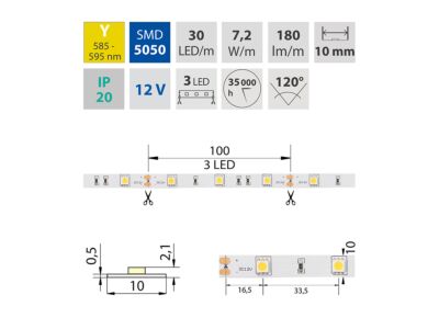 LED pásek SMD5050, žlutá (590nm), 7,2W, 30LED, 180lm/m, segment 100mm, 3LED/segment, IP20, DC 12V, životnost 54000h, šíře 10mm, bílý PCB pásek, max. délka pásku při jednostranném zapojení: 5m, opatřen samolepící páskou 3M.