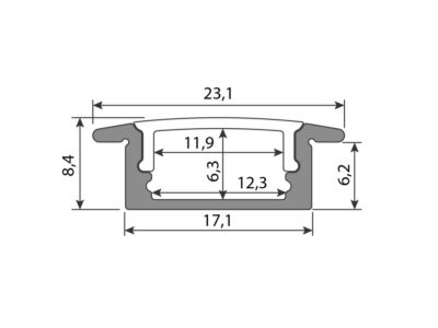 Vestavný hliníkový profil pro LED pásky, rozměry průřezu cca 23x8 mm. Součástí je mléčný difuzor, který lze do profilu nacvaknout. Tento profil je určen pro krytí a chlazení LED pásků do šíře 12 mm. Upevnění k podkladu lze provést pomocí vrutů, lepidel. K profilu lze zakoupit koncovky.