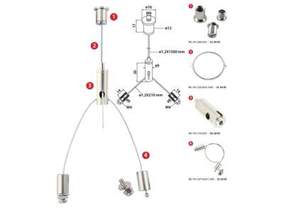 Sada k zavěšení např. svítidel - obsahuje 1x pozinkované ocelové lanko délky 1,5m, 1x kulatou stropní příchytku a 1x závěsné ocelové lanko, 1,2x200mm, zakončené válečkem 14 x 8,8mm M4.