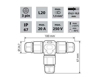 Kabelová spojka - tvar T, IP67, šroubovací kontakty, L20, 3piny. Rozměry spojky: 100mm x 67mm x 25mm, max. 20A/250V, pro průměry kabelu 6,5 - 10,5mm, max. průřez 4mm².