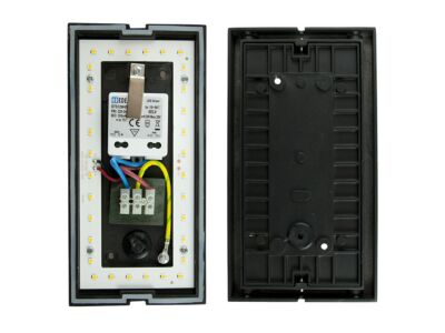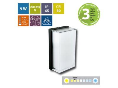LED nástěnné a fasádní svítidlo Ether, černá barva, 9W, 230V, IP65, teplá bílá (3000K), světelný tok 670lm, vyzařovací úhel 135°, CRI 80, životnost až 30.000h, rozměry 120 x 80 x 220, materiál hliník/plast, nestmívatelné.