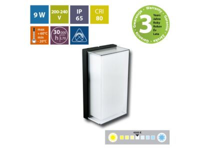 LED nástěnné a fasádní svítidlo Ether, černá barva, 9W, 230V, IP65, neutrální bílá (4000K), světelný tok 720lm, vyzařovací úhel 135°, CRI 80, životnost až 30.000h, rozměry 120 x 80 x 220, materiál hliník/plast, nestmívatelné.