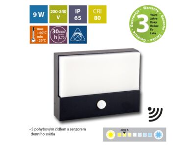 LED nástěnné a fasádní svítidlo Kerberos, s IR senzorem pohybu a denního osvětlení (dosah až 8m), černá barva, 9W, 230V, IP65, teplá bílá (3000K), světelný tok 600lm, vyzařovací úhel 88°, CRI 80, životnost až 30.000h, rozměry 180 x 135 x 50, materiál hliník/plast, nestmívatelné.