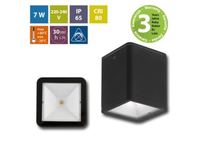 LED stropní svítidlo Noel S, černá barva, 7W, 230V, IP65, teplá bílá (3000K), světelný tok 549lm, vyzařovací úhel 102°, Ra>80, životnost až 30.000h, A+, rozměry 85 x 85 x 105, materiál hliník/plast, nestmívatelné, PF>0,5.