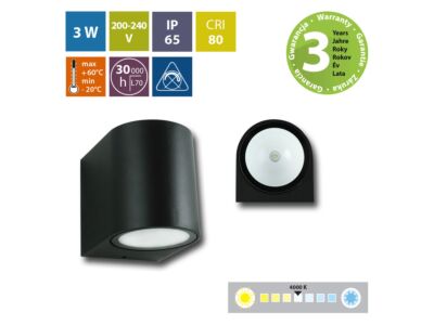 LED nástěnné a fasádní svítidlo Revos R, černá barva, 3W, 230V, IP65, neutrální bílá (4000K), světelný tok 150lm, vyzařovací úhel 37°, CRI 80, životnost až 30.000h, rozměry 68 x 92 x 78, materiál hliník/plast, nestmívatelné.