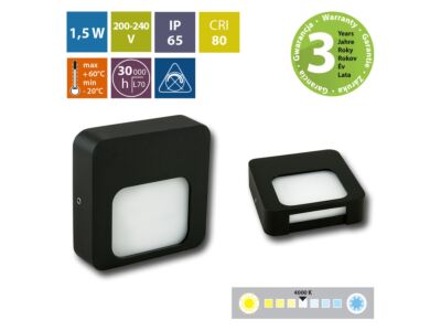 LED nástěnné a fasádní svítidlo Ursa S, černá barva, 1,5W, 230V, IP65, neutrální bílá (4000K), světelný tok 62lm, vyzařovací úhel 110°, CRI 80, životnost až 30.000h, rozměry 90 x 90 x 20, materiál hliník/plast, nestmívatelné.