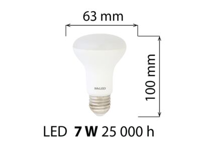 LED žárovka reflektor R63 7W (ekvivalent 60W), patice E27, 230V, 2700K - teplá bílá, světelný tok Φ use 360° 600lm, vyzařovací úhel 120°, CRI 80, úspora až 88%, životnost až 25.000h, 15.000 spínacích cyklů, rozměry ø 63 x 100 mm, nestmívatelná