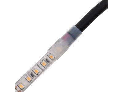 Silikonová koncovka s otvorem pro přívod napájení pro pásky IP67 šíře 10mm, 1ks. Koncovka je vhodná pro ploché kabely max. 2xAWG11 a kulaté kabely max. 7,8mm. Nutno utěsnit voděodolným silikonovým lepidlem.