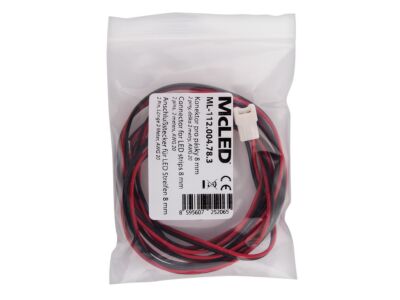 Připojovací konektor jednobarevných LED pásků šíře 8mm, 2 piny. Konektor využijete ke snadnému propojení jednobarevných LED pásků o šíři 8mm s řízením, nebo napájecími zdroji, které mají na výstupu svorkovnici nebo kabely (zdroje jsou tedy bez konektoru). Konektor doporučujeme pro max. proud 3A, pro větší proudy je třeba vodiče k LED pásku připájet. Připojovací konektor lze použít na LED pásky s max. 120LED/m. Celková délka cca 2m. Rozměry bílé části: 10,5x16,3x4,8mm. Barvy kabelů: červená, černá, velikost AWG20/0,5mm².
