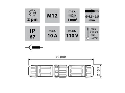 Pár vidlice + zásuvka, IP67, pájecí, pozlacené kontakty, M12, 2piny - například pro jednobarevné LED pásky. Průřez připájitelného kabelu max. 1mm², průměr kabelu 4,5-6,5mm, max. 10A/110V. Rozměry: 75x15,7mm.