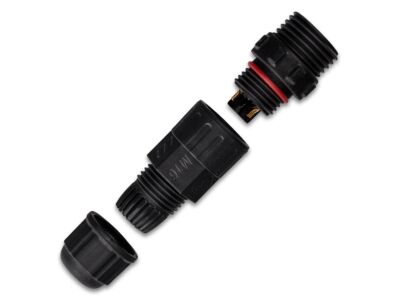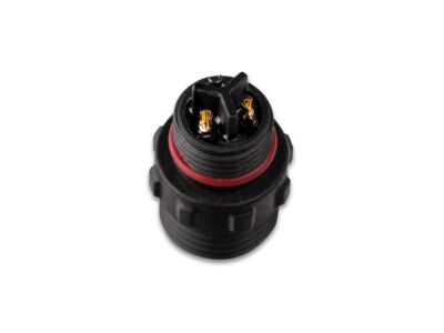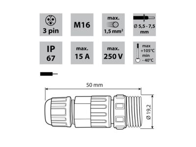 Vidlice bez převlečné matice, IP67, pájecí, pozlacené kontakty, M16, 3piny - například pro dual white (CCT) pásky. Průřez připájitelného kabelu max. 1,5mm², průměr kabelu 5,5-7,5mm, max. 15A/250V. Rozměry: 50x19,2mm.