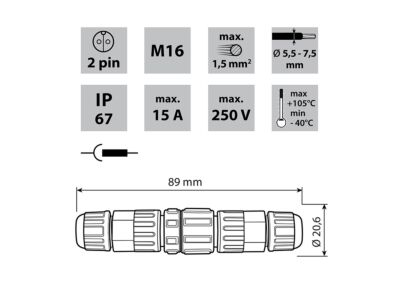 Pár vidlice + zásuvka, IP67, pájecí, pozlacené kontakty, M16, 2piny - například pro jednobarevné LED pásky. Průřez připájitelného kabelu max. 1,5mm², průměr kabelu 5,5-7,5mm, max. 15A/250V. Rozměry: 89x20,6mm.