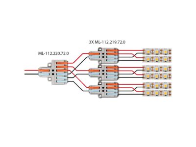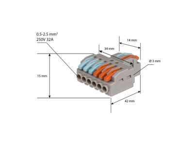 Kabelová svorka s páčkou, umožňuje rozbočení vstupu na tři výstupy, celkem 2 vstupy a 6 výstupů, barvy oranžová, modrá.