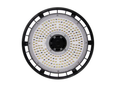 LED průmyslové svítidlo 150 W, černý, 230 V, IP65, 5000 K, světelný tok 21660 lm, vyzařovací úhel 90 °, CRI80, životnost > 50.000 h, rozměry ø 280 x 159 mm, materiál hliník/plast, stmívatelné 0-10 V, PF>0,95, ke svítidlu lze dokoupit Al nebo PC reflektor a pohybové čidlo.