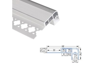 Nášlapný hliníkový profil pro LED pásky, rozměry průřezu cca 68x27 mm. Součástí je mléčný difuzor, který lze do profilu nacvaknout. Tento profil je určen pro krytí a chlazení LED pásků do šíře 12 mm a max 19,2W/m. Upevnění k podkladu lze provést pomocí montážních úchytů, vrutů, lepidel. K profilu lze zakoupit úchyty a koncovky.