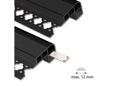 Nášlapný hliníkový profil černý pro LED pásky, rozměry průřezu cca 68x27 mm. Součástí je černý difuzor, který lze do profilu nacvaknout. Tento profil je určen pro krytí a chlazení LED pásků do šíře 12 mm a max. 19,2 W/m. Upevnění k podkladu lze provést pomocí montážních úchytů, vrutů, lepidel. K profilu lze zakoupit úchyty a koncovky.