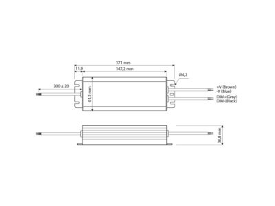 LED stmívatelný zdroj 60W, typ Mean Well HLG-60H-24B. Stmívání signálem 1-10VDC, PWM, proměnným odporem (100kohm). Krytí IP67, výstup 24VDC, 2,5A. Vstup: 90-305VAC, 47-63Hz, účinnost > 89,5%, PF > 0,95, materiál krytu: hliník. Rozměry: 171x61,5x36,8mm, hmotnost: 730g. Při volbě zdroje počítejte s výkonovou rezervou min. 20%.