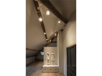 Dlouhá, flexibilní sada držáků na zeď pro nízkonapěťový lanový systém.