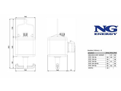 Zásuvky: 2x 16A/400V/5p, 2x 230V s ochr. kolíkem (česká),