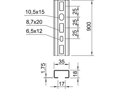 OBO BETTERMANN Profilová lišta, děrovaná, šířka výřezu 17mm, 900x35x18, Ocel, St, žárově zinkováno ponorem, DIN EN ISO 1461 typ CMS3518P0900FT