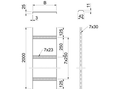 Kabelový žebřík pro stavbu lodí s děrovanou bočnicí výšky 25 mm s přivařenými dolů otevřenými a děrovanými trapézovými příčkami. Zatížení ověřeno dle požadavků IEC v kombinaci se spojkou typu SLV.