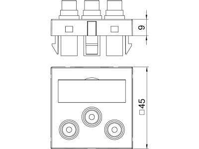 Multimediální nosič se třemi zdířkami cinch pro audio a video, rovný vývod kabelů, s popisovým polem, tři konektory cinch (RCA) v provedení zdířka-zdířka, barevné kódování: žlutá/červená/bílá. Nosná deska upevňovaná naklapnutím, vhodná pro vodorovnou i svislou montáž do systémového prostředí.