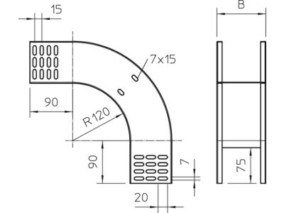 Svislý oblouk 90° v klesajícím provedení pro všechny typy kabelových žlabů s výškou bočnice 85 mm.