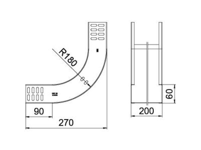 Svislý oblouk 90° ve stoupajícím provedení pro všechny typy kabelových žlabů s výškou bočnice 60 mm.