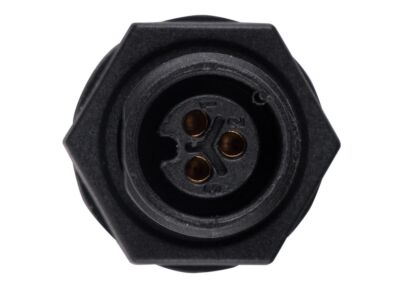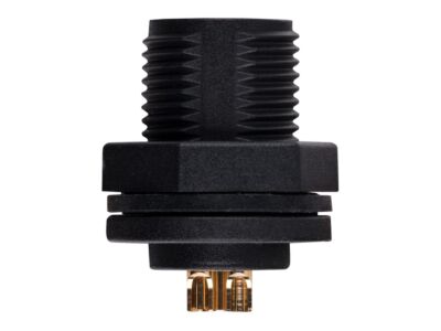 Panelová zásuvka bez převlečné matice, IP67, pozlacené kontakty, pájecí - vnější montáž, M12, 3piny. Konektor lze propojit s 3-pinovými konektory M12 - vidlicemi s maticí. Max. 110V/10A. Délka cca 23mm, průměr 18mm.