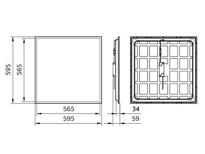 Rastr 600x600 mm, Visible profile ceiling version, Ocel, Bílá, Signální bílá (RAL9003), Externí napájecí zdroj (zapnuto/vypnuto), 4100 lm, 34 W, 120 lm/W, 4000 K, (0.38, 0.38) SDCM ≤5, Vyzařovací úhel 120°, Mikroprizmatická čočka, Akrylát, IP20/40 | Ochrana proti vniknutí prstů, ochrana proti proniknutí drátů, IK02 | 0,2 J standardní, Bezpečnostní třída II, 2× 0,75mm², Volné přívody / kabely