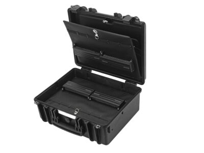 Kufr na nářadí Gigant-S, prachotěsný a vodotěsný kufr na nářadí s krytím IP67, stohovatelný, odolný proti rozbití a nárazu. Odolný vůči kyselinám a teplotám -33 °C/+90 °C. Vybaven přihrádkou na dokumenty, ergonomickou dvousložkovou rukojetí a výklopnými uzávěry pro volitelný visací zámek. Kufr je vybaven manuálním vyrovnávacím ventilem pro vyrovnání přetlaku. Těsnicí O-kroužek ve víku chrání obsah velmi stabilního a robustního kufru. Hmotnost prázdného kufru: 6 500 g; vnější rozměry: Š/D/H: 478/412/214 mm; vnitřní rozměry D/W/H1/H2/H#: 445/345/130/60/190 mm.