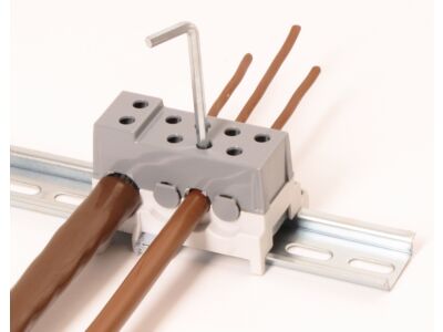 Blok pro rozdělení fází PVBS 250-7, 1pólový, pro AL/CU vodiče, jmenovitý proud 250A, jmenovité napětí 690V, barva šedá, montáž na DIN lištu / PANEL, krytí IP20, vstup 1x95mm2, výstup 7x50mm2, rozměr 72x45x47mm.