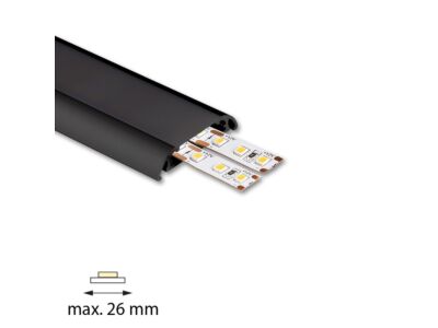 Hliníková základna k přisazenému profilu PXA, černá, bez difuzoru. Lze dokoupit černý difuzor. Tento profil je určen pro krytí a chlazení LED pásků do šíře až 26 mm a výkonu max. 28,8 W/m. Profil lze upevnit pomocí samostatně prodávaných kovových úchytů, případně jej lze přivrtat nebo přilepit. K profilu s difuzorem lze zakoupit také koncovky.