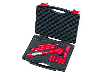 Sada pro domovní přípojky 1 000 V, 21 dílů, v přepravním a skladovacím kufříku z nárazuvzdorného plastu, skládající se z ponorného izolovaného nářadí: 1 x 1/4" momentový klíč a bitová vložka od 5 -25 Nm pro: 1 x šrouby s drážkou 4,0x0,5 mm, 1 x prodlužovací nástavec 1/4" a vložka s bity 75 mm pro: 1 x křížový šroub PH 1, 1x nástrčka 1/4" a vložka bitu 6 mm pro: 1 x křížový šroub Phillips PH 2, 1x 1/4" nástrčka a bitová vložka 8 mm pro: pro 1x šestihran (imbus) 5 mm, 1x objímka 1/4" a bitová vložka 14 mm pro 1x šestihran (imbus) 6 mm, 2x držák bitu 1/4" pro 1x šestihran (imbus) 8 mm. Rozměry: 255x210x45 mm