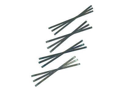 Sortiment pilových kotoučů podle DIN 6494, tvar C, délka 15 mm, šířka 6 mm, tloušťka 0,4 mm. Obsah: po 3 univerzálních pilových listech (rozteč zubů 1,0 mm (25 zubů na palec), pilové listy na kov (rozteč zubů 0,8 mm (32 zubů na palec), jemné pilové listy na kov pro obzvláště jemné řezy bez otřepů i do velmi tenkých plechů (rozteč zubů 0,5 mm (50 zubů na palec), pilové listy na dřevo (rozteč zubů 1,8 mm (14 zubů na palec)).