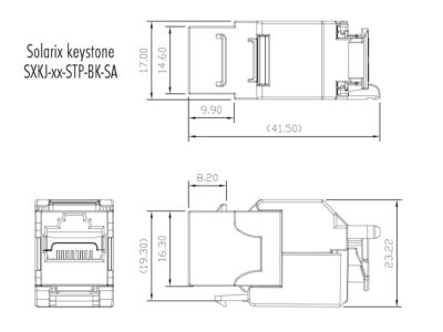 Samořezné keystony Solarix se vyznačují velmi jednoduchou instalací, ke které není nutné použít zařezávací nástroj. Tyto keystony bez problémů splňují parametry specifikované v mezinárodních standardech strukturované kabeláže ANSI/TIA 568, ISO/IEC 11801 a EN 50173 pro kategorii 6A a třídu vedení Class EA, včetně všech nejnovějších dodatků. Keystony jsou osazeny 180° samořeznou svorkovnicí, která je označena barevným schématem podle typu zapojení, a to buď podle standardu T568A, nebo T568B. Do této svorkovnice je možné zařezat kabely typu drát s vodiči o velikosti AWG 26 – 22. Standardní barva nestíněných samořezných keystonů Solarix je černá, u stíněné verze je tělo modulu opatřeno stříbrnou kovovou částí. Díky svým kompaktním rozměrům jsou tyto samořezné keystony kompatibilní s modulárními zásuvkami většiny výrobců (např. ABB, Schneider, Legrand, Moeller, Hager, Obzor atd.). Tuto kompatibilitu si můžete ověřit v tabulce kompatibility, která se nachází v souborech ke stažení.