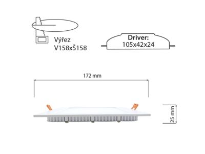 LED podhledové svítidlo 15W bílé, 230V, IP20, 3000K - teplá bílá, světelný tok 1080lm, vyzařovací úhel 120°, CRI 80, životnost 50.000h, rozměry 172x172x25mm, materiál hliník/plast, nestmívatelné, PF>0,9