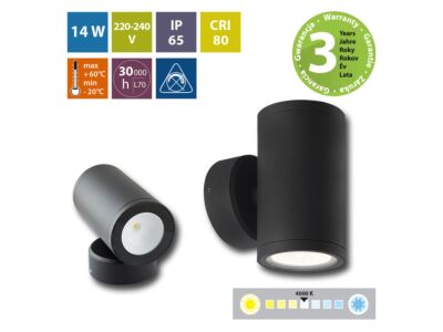 LED venkovní nástěnné svítidlo Verona 2R, černá barva, 2x7W, 230V, IP65, neutrální bílá (4000K), světelný tok 2x445lm, vyzařovací úhel 102° - svítí do dvou směrů, CRI 80, životnost až 30.000h, rozměry 100 x 135 x 160, materiál hliník/plast, nestmívatelné.