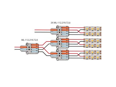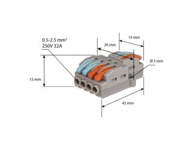 Kabelová svorka s páčkou, umožňuje rozbočení vstupu na dva výstupy, celkem 2 vstupy a 4 výstupy, barvy oranžová, modrá.