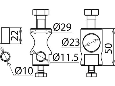 Upevňovací svorník pro montáž zavěšeného hliníkového lana 50 mm² kat. č. 840 080 na jímací tyč (Ø 22/Ø 16 mm) nebo na připojovací destičku (např. kat. č. 819 289 nebo 819 288).