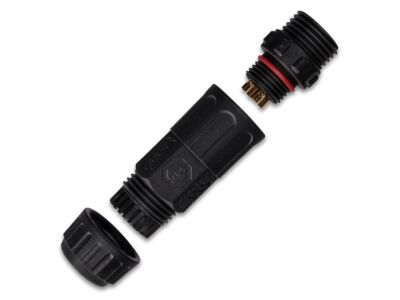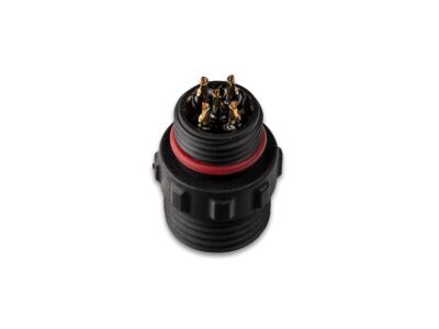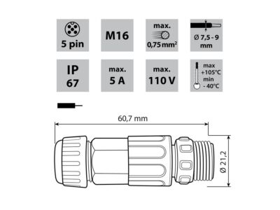 Vidlice bez převlečné matice, IP67, pájecí, pozlacené kontakty, M16, 5pinů - například pro RGB+W LED pásky. Průřez připájitelného kabelu max. 0,75mm², průměr kabelu 7,5-9mm, max. 5A/110V. Rozměry: 60,7x21,2mm.