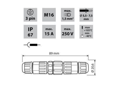 Pár vidlice + zásuvka, IP67, pájecí, pozlacené kontakty, M16, 3piny - například pro dual white (CCT) pásky. Průřez připájitelného kabelu max. 1,5mm², průměr kabelu 5,5-7,5mm, max. 15A/250V. Rozměry: 89x20,6mm.