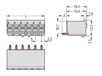 1vodičový konektor (zásuvka) THR, přímý; Tlačítko; Push-in CAGE CLAMP®; 2,5 mm²; Rozteč 5 mm; 6pól.; Pájecí kontakt Ø 1,4 mm; Postříbřené kontakty; 2,50 mm²; Světle šedá