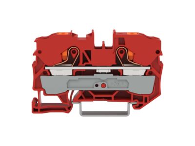 2vodičová průchozí svorka; s ovládacím tlačítkem; 10 mm²; Se zkušebním otvorem; Boční a středový popis; Na DIN lištu 35 × 15 a 35 × 7,5; Push-in CAGE CLAMP®; 10,00 mm²; Červená