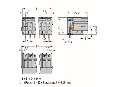 Konektor s pájecími piny THT; Pájecí kontakt 1,0 × 1,0 mm; Úhlové provedení; Rozteč 5 mm; 2pól.; Šedá
