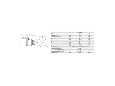 zásuvka vestavná 4-pólová, 125A / 500V, 7h, IP67, příruba 120x120mm, přímá, POWER TWIST